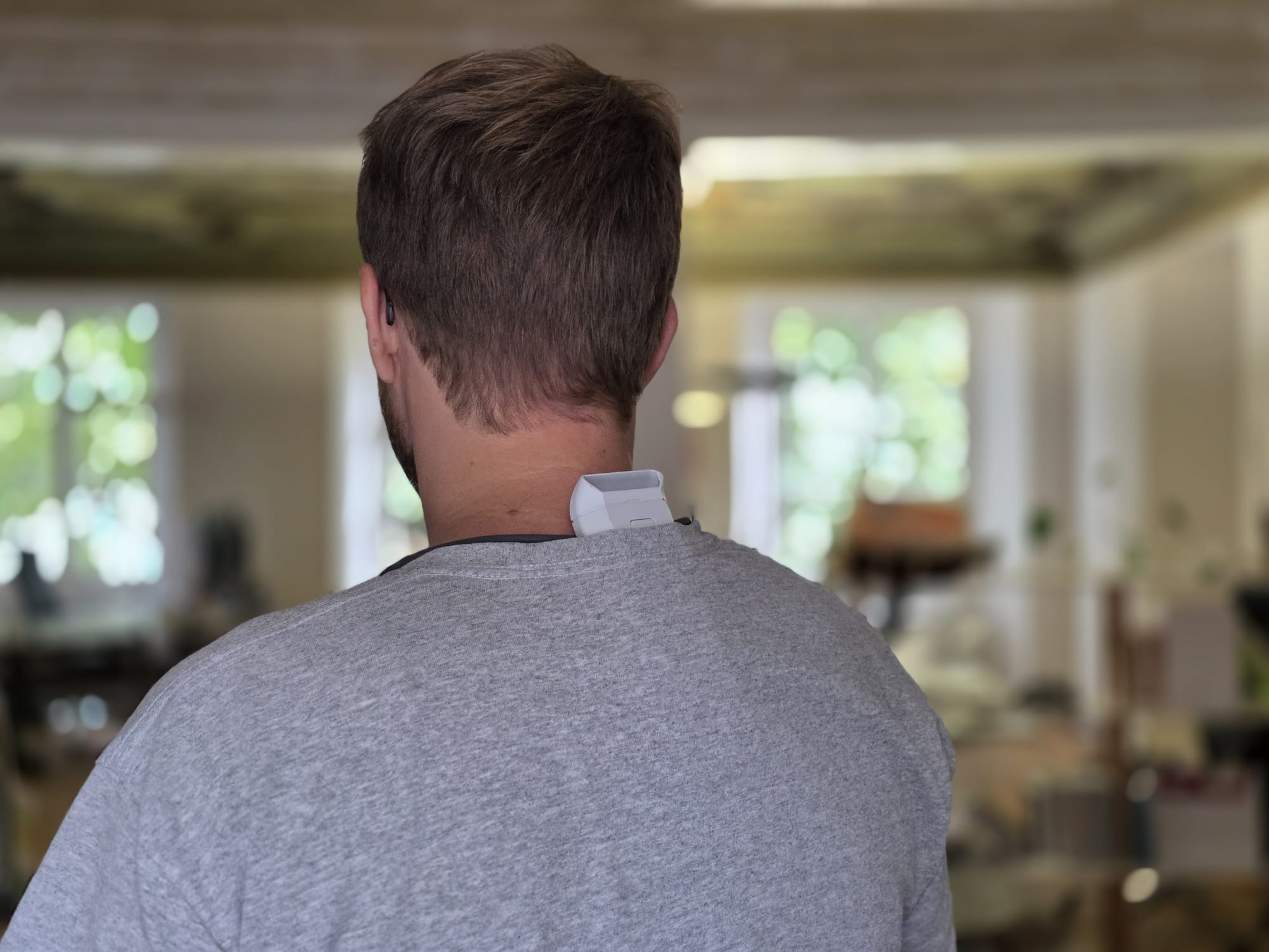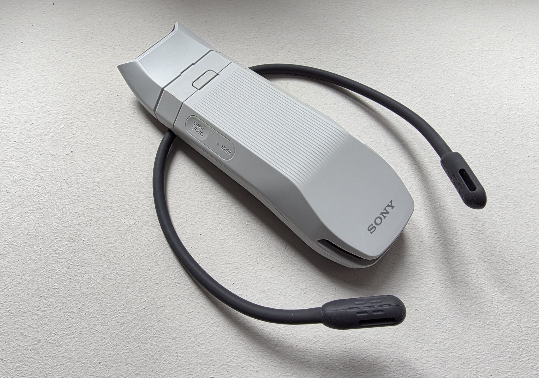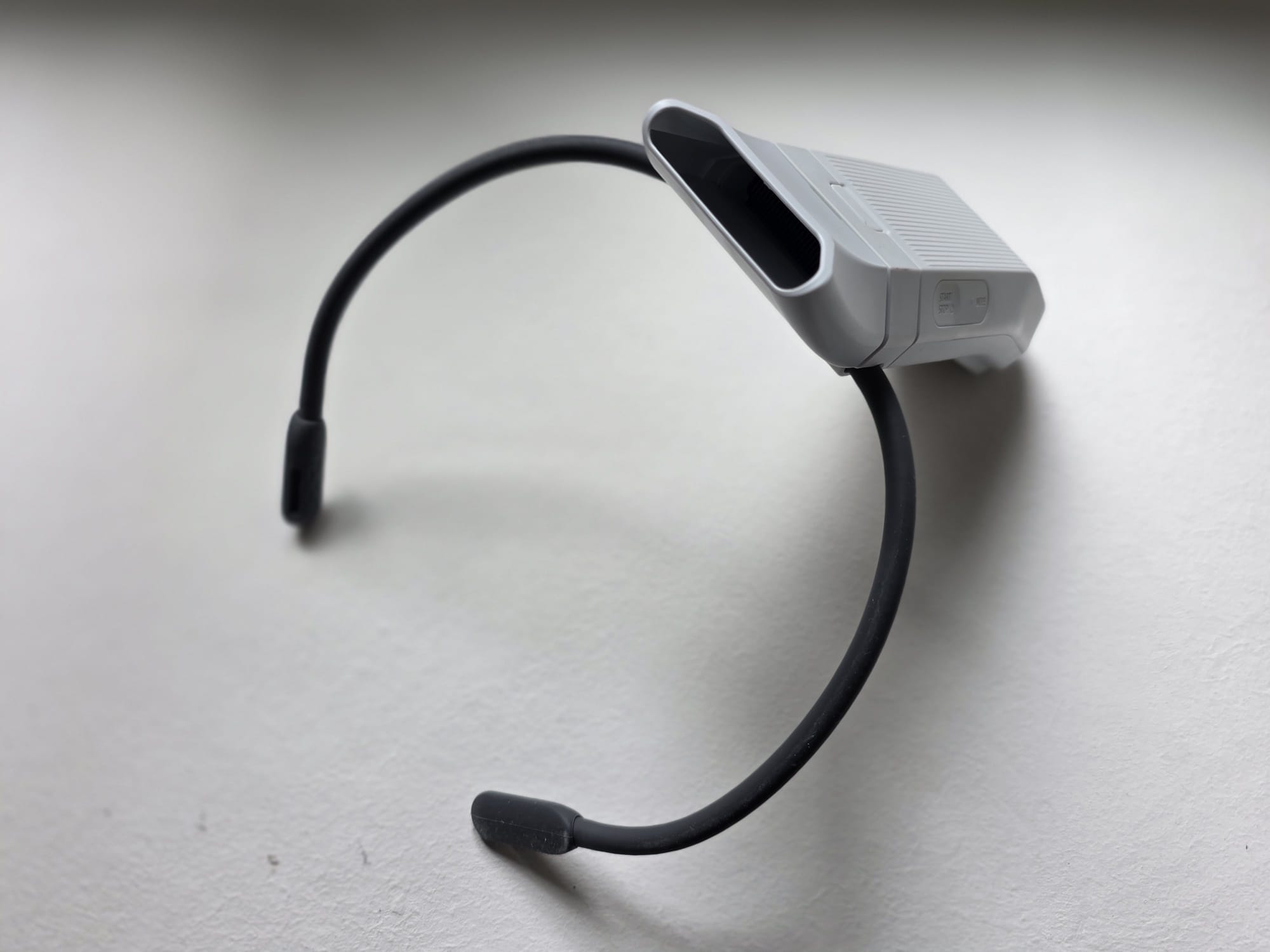 Erst einmal muss ich das Reon Pocket Pro an mir befestigen. Das geschieht durch ein flexibles Nackenband. Dieses legt man sich um den Hals, das Gerät selbst liegt dann teils auf dem Nacken, teils auf dem Rücken auf. Die Silikon-Enden fühlen sich angenehm an, nichts drückt oder kratzt.