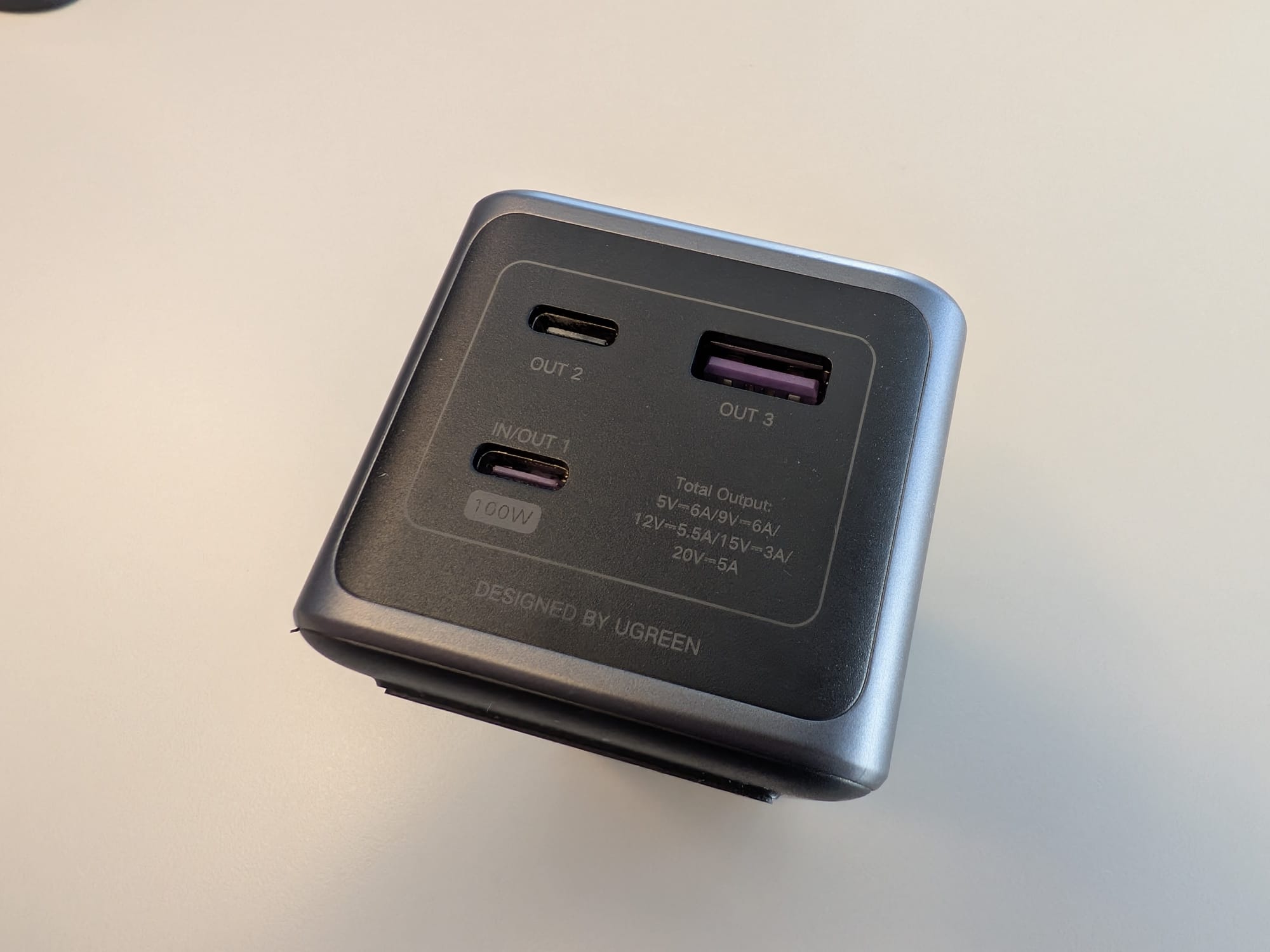 Ugreen spendiert der Nexode Powerbank gleich drei Ladeanschlüsse. Neben einem USB-A-Anschluss gesellen sich zwei USB-C-Anschlüsse dazu, wovon einer auch fürs Aufladen der Powerbank mit maximal 65 Watt verwendet wird. Mit zwei angeschlossenen Geräten (USB-C1 + USB-C2) ist eine maximale Ladeleistung von 130 Watt möglich. Der USB-C1-Anschluss erreicht alleine eine Leistung von bis zu 100 Watt. Der USB-C2-Anschluss bringt es auf bis zu 30 Watt und der USB-A-Anschluss auf eine Leistung von maximal 22,5 Watt. Sind alle drei Anschlüsse besetzt, kann die Powerbank eine Leistung von maximal 115 Watt erreichen.