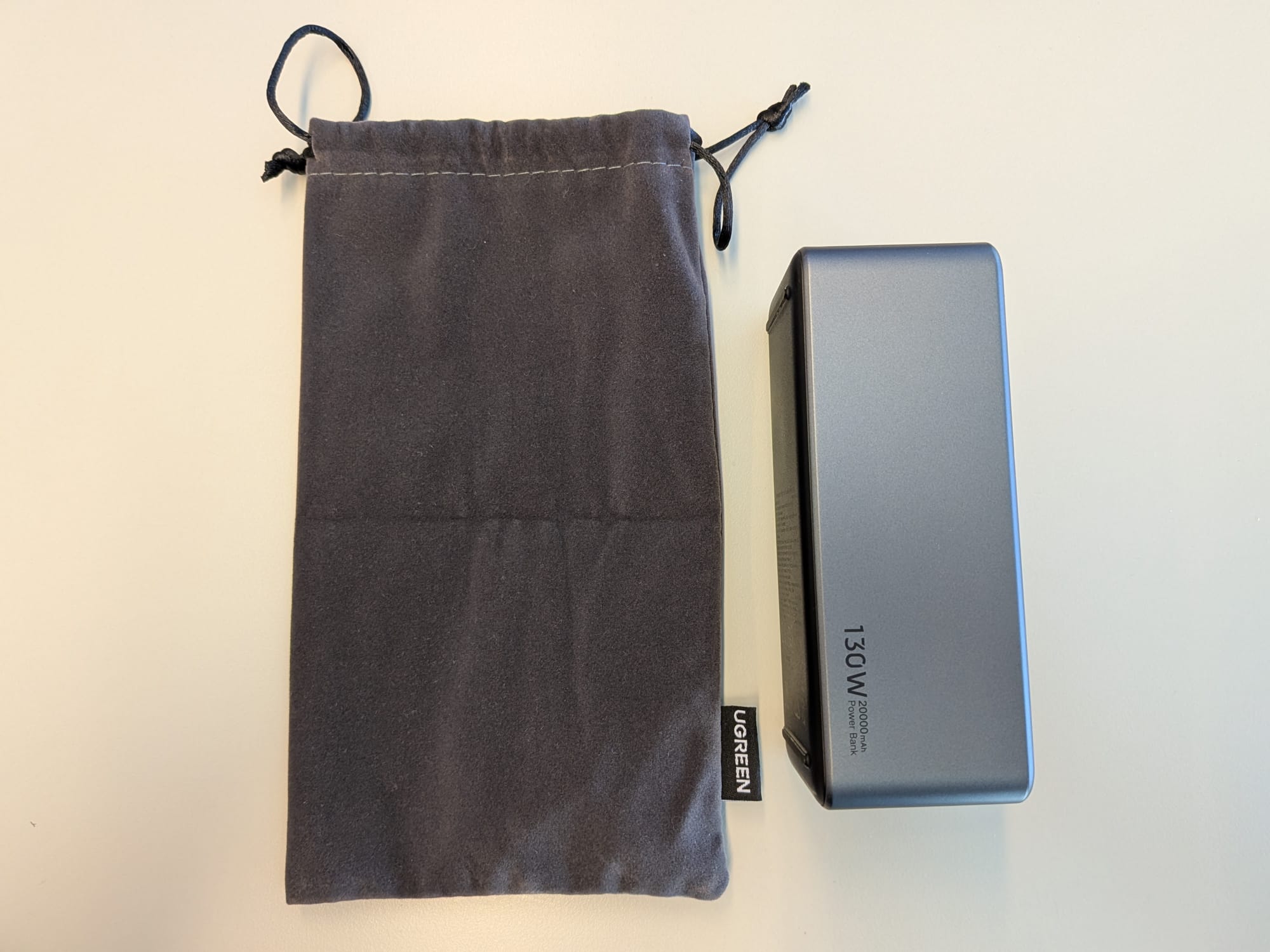 Der Lieferumfang ist schnell abgehakt: Neben der Powerbank gibt es ein USB-C- auf USB-C-Kabel, ein wertiger Reisebeutel und eine Kurzanleitung. Mehr befindet sich nicht in der Verpackung. Wichtig zu wissen: Um die Powerbank vernünftig aufladen zu können, benötigt man ein Netzteil mit mindestens 65 Watt. Solltest du kein entsprechendes Netzteil haben, solltest du dir ein entsprechendes dazu kaufen.
