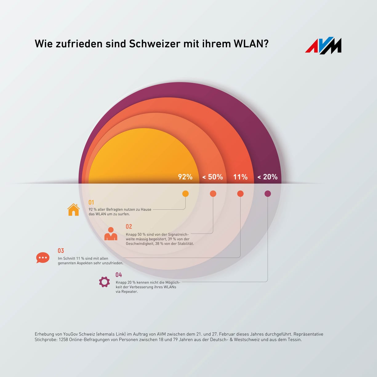 Im Rahmen einer von YouGov Schweiz (ehemals LINK) im Auftrag des Berliner Unternehmens Fritz! (ehemals AVM) durchgeführte Erhebung wurden zwischen dem 21. und 27. Februar dieses Jahres 1'258 Online-Befragungen zum Thema WLAN zu Hause vollzogen. Die repräsentative Stichprobe besteht aus Personen zwischen 18 und 79 Jahren aus der Deutsch- & Westschweiz und aus dem Tessin.