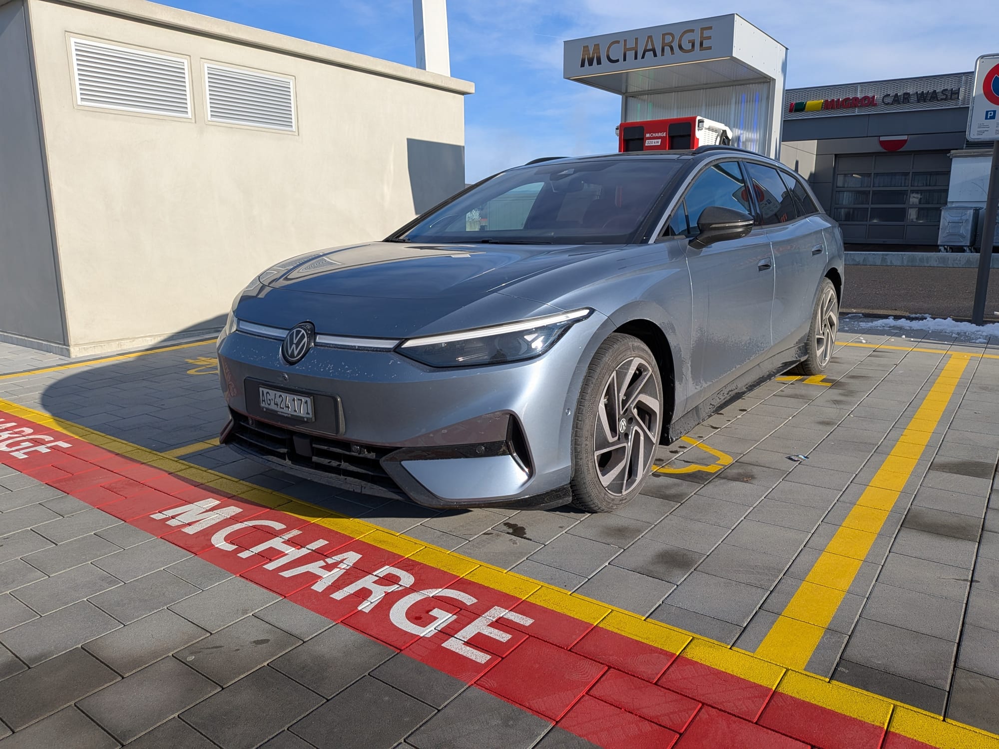 Wie sieht es mit der Ladegeschwindigkeit aus? An einer Wallbox lädt der ID. 7 Tourer Pro mit maximal 11 kW. Leider bietet VW keine Option auf 22 kW an. An einem Schnelllader sind bis zu 175 Watt unter optimalen Bedingungen möglich. Diese Leistung konnte ich im Test nie erreichen, auch nicht mit vorkonditionierter Batterie. Die Spitze lag bei unterschiedlichen Ladeanbietern (IONITY, Fastned und Migros M-Charge) jeweils bei knapp über 100 kW, fiel dann ab einem Ladestand von ca. 60 Prozent auf 75 kW zurück.