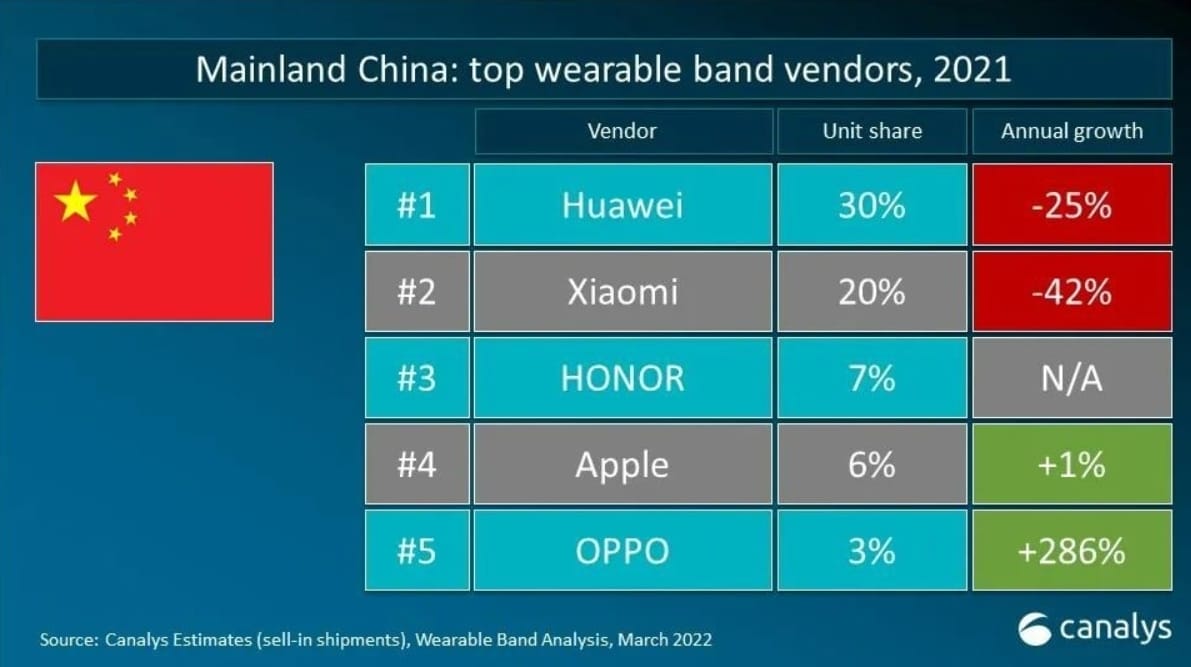 Einen starken Rückgang hat auch Huawei hinnehmen müssen. Ganze 40 Prozent weniger Wearables haben die Chinesen ausgeliefert. Trotzdem sind sie mit 10 Prozent Marktanteil noch auf Platz 3 gelandet. Der starke Rückgang kam unter anderem daher, dass Huawei seine Tochter Honor verkauft hat, die ebenfalls einige Wearables im Programm hat. Natürlich dürfte auch der US-Bann seinen Tribut gefordert haben, der Huawei ausserhalb Chinas vor grosse Herausforderungen gestellt hat. Mittlerweile haben sich die Chinesen im Wearables-Bereich aber wieder neu aufgestellt und dürften 2022 wieder mehr Wearables ausserhalb Chinas verkaufen.