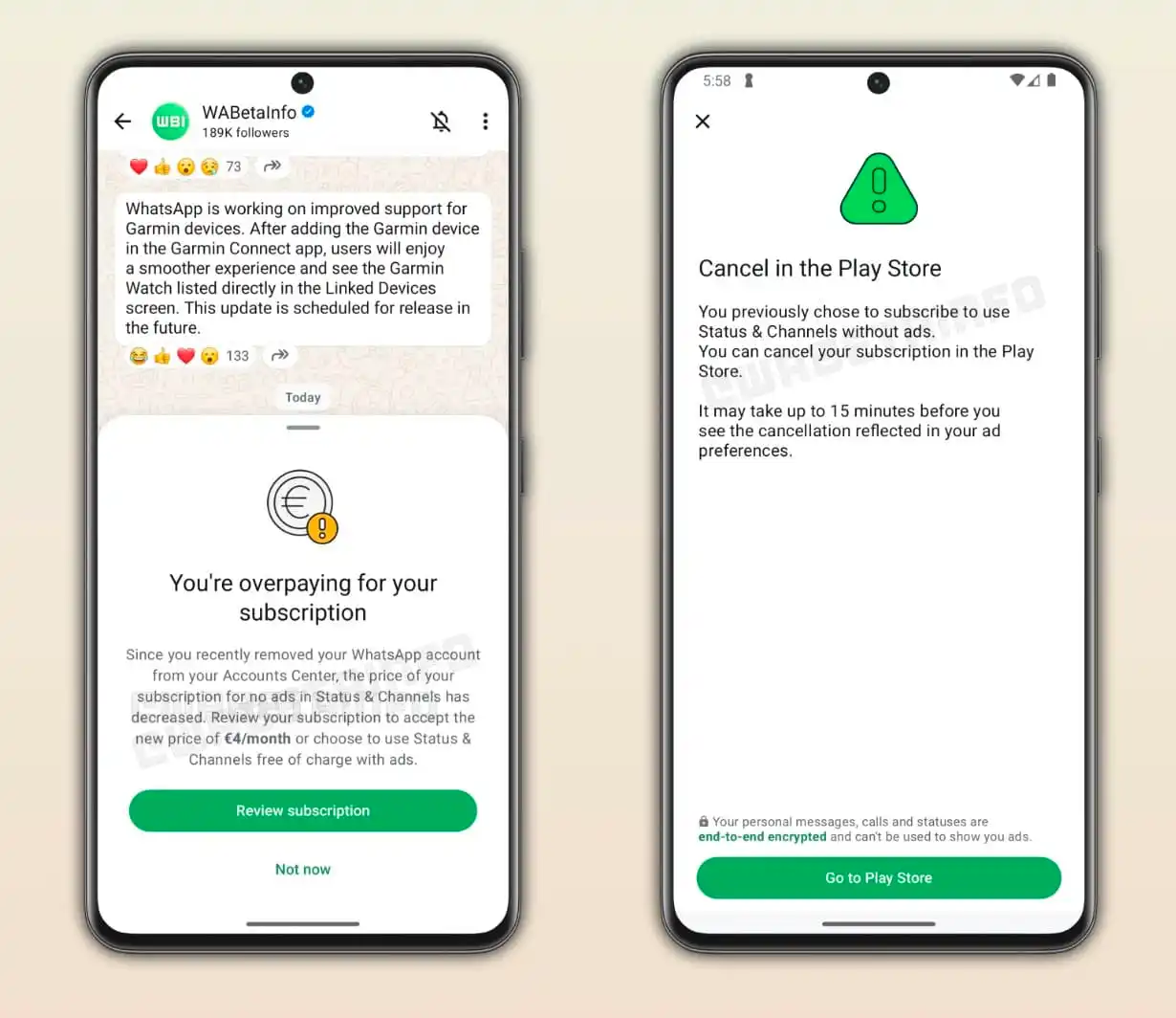 Wer keine Werbung sehen möchte, wird künftig ein kostenpflichtiges Abonnement kaufen können. Das geht aus der aktuellen Beta-Version von WhatsApp hervor. Die nötige Funktion ist dort bereits eingebaut, aber noch nicht direkt zu sehen. WABetainfo konnte die entsprechende Funktion jedoch bereits jetzt einsehen und zeigt erste Screenshots zur geplanten Funktion.