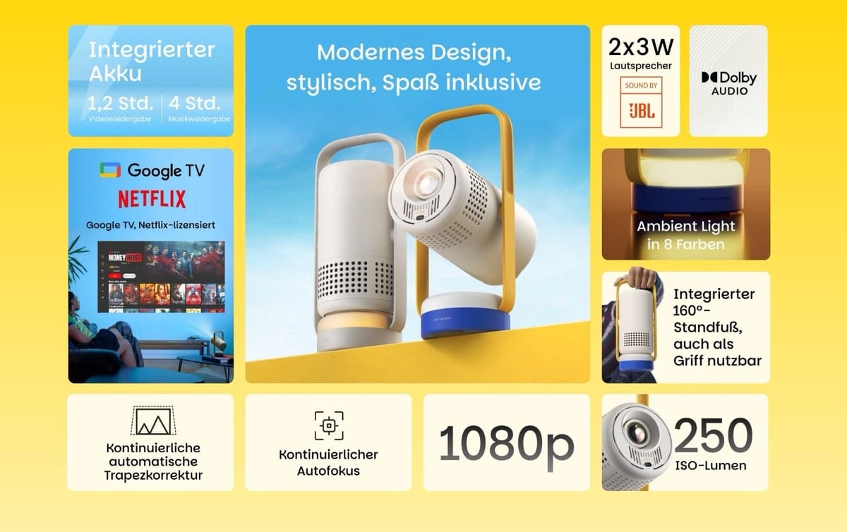 Vibe One ist als Einstiegsmodell für Nutzer:innen gedacht, die bisher keine Erfahrung mit Projektoren haben. Dafür kombiniert XGIMI im Vibe One zusätzliche Funktionen, etwa Beluchtungsmodi, integrierte Lautsprecher und Streaming-Angebote. Durch seine kompakte Bauweise, den integrierten Standfuss und dem optional erhältlichen Akku kann das Gerät in verschiedenen Alltagssituationen eingesetzt werden.